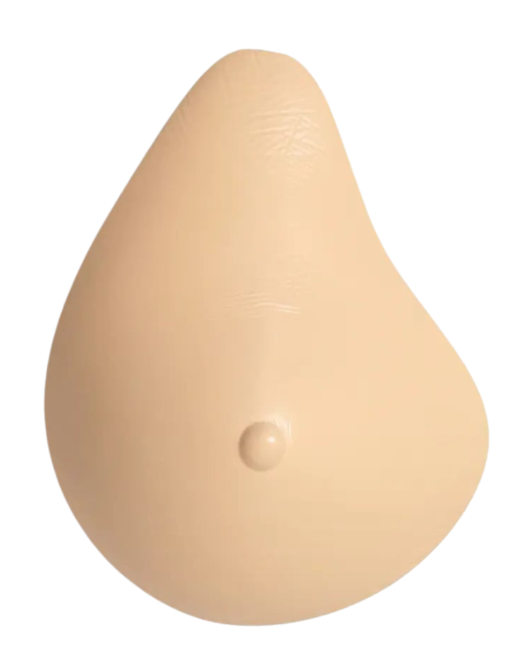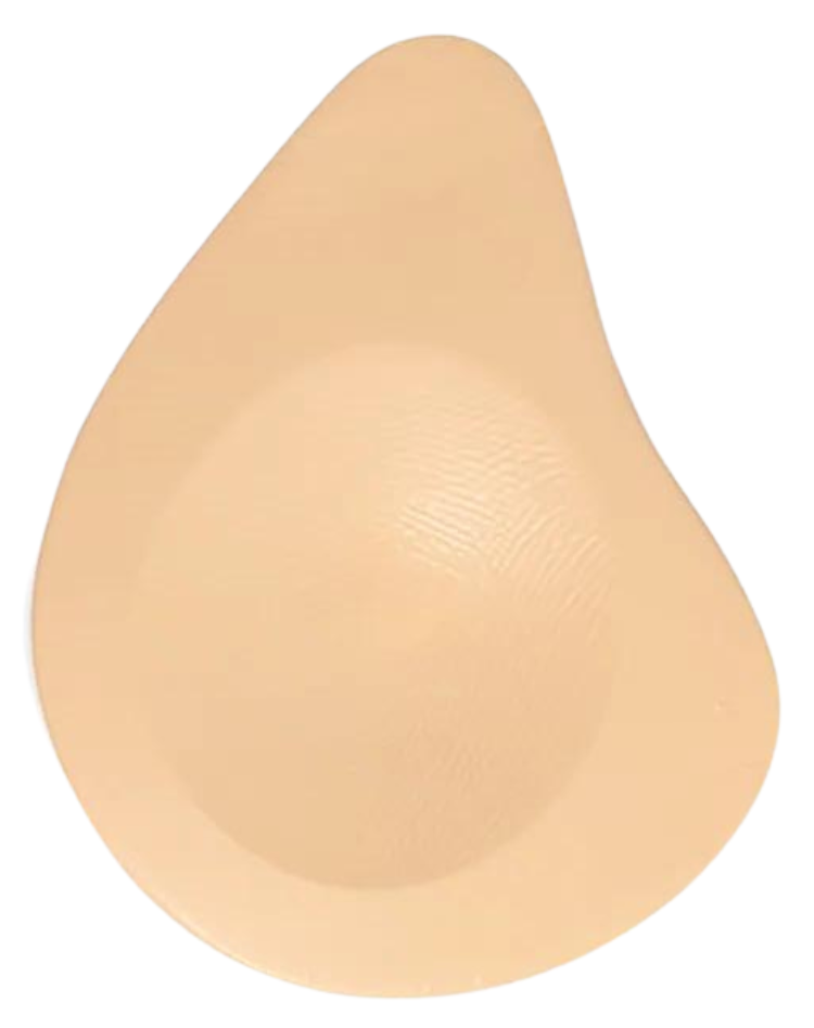 Prótesis externa de silicón con peso ligero y textura real, forma de gota asimétrica para que se acomode mejor a los diseños de los bras.